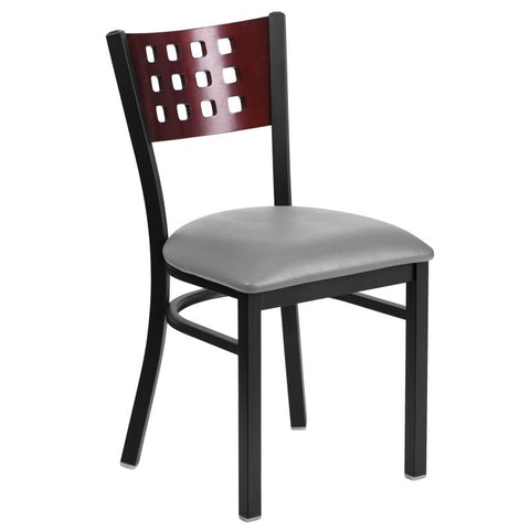 12 Square Metal Restaurant Chair - Mahogany Wood Back, Burgundy Padded Seat