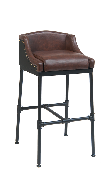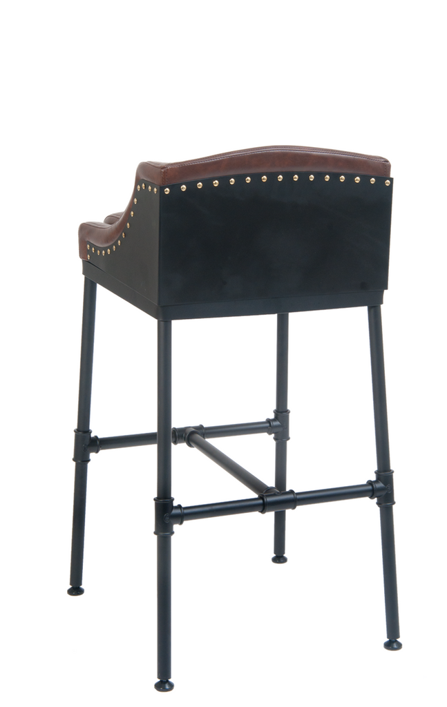 Black Powder Coated Metal Bar stool with Brown Color Vinyl Seat & Back, Industrial Pipe Fitting Design, Pipe Footrest,